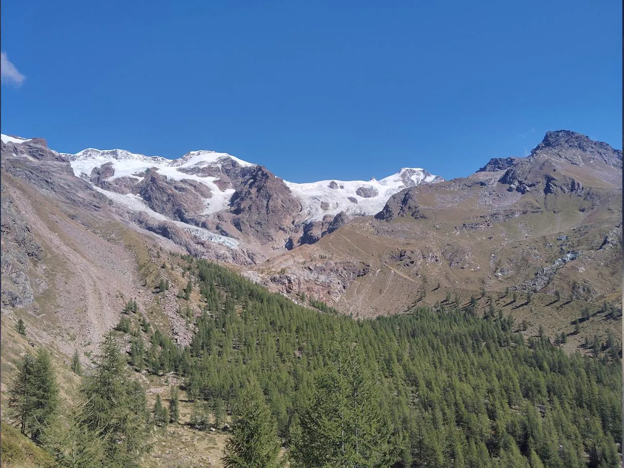 Nous partons ensuite par un joli chemin en face du Mont Rose, les glaciers qui nous surplombent sont superbes, le chemin est sauvage et nous croiserons surement des bouquetins et des marmottes. Nous mangeons à plus de 3000 mètres d'altitudes et sommes entre la vallée de Champoluc et celle de Gressoney, sur notre chemin nous croisons des Alpinistes qui montent en direction du refuge Sella pour réaliser l'Ascension du Castor qui culmine à 4228 mètre d'altitude. Nous descendons ensuite à notre refuge assez rapidement pour dormir en lisière d'une foret de mélèze avec une belle vue sur la vallée de Champoluc.