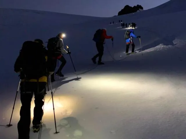 Nous partons de nuit à la frontale après quelques minutes nous arrivons sur le glacier est nous mettons les crampons et partons encordé sur le glacier, l'ascension du glacier est techniquement facile, les pentes que nous montons sont d'environ 35 ° et c'est assez progressif donc au sommet pour la dernière pentes à 4500 m d'altitude vous aurez déjà bien l'habitude de marcher avec les crampons. La montée le long du glacier est magnifique avec les Lyskams qui nous surplombe et au sommet la vue est exceptionnel au niveau de la Punta Gnifetti nous pouvons profiter de reprendre des forces au refuge qui est le plus haut refuge d'Europe avec sa pizza renommé qui est également la plus haute d'Europe.